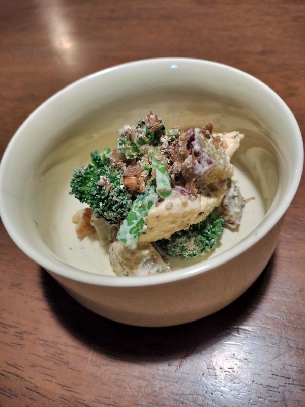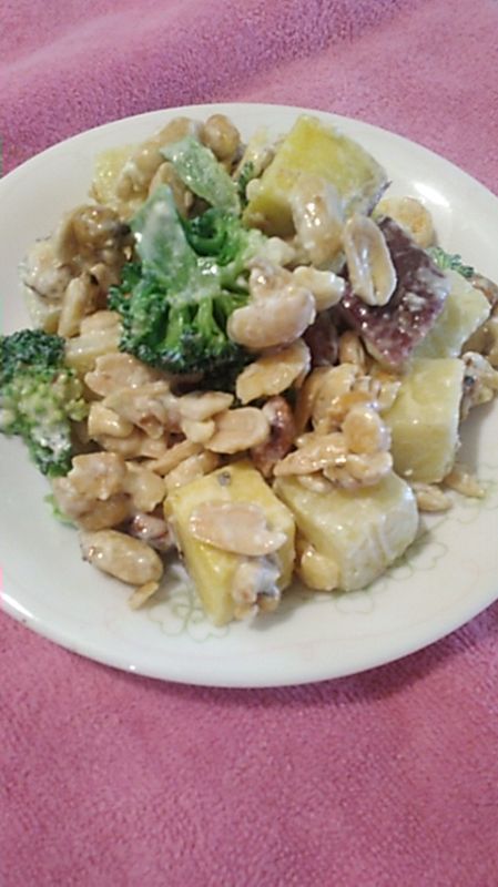 7.器に盛り付けたらさつまいもとブロッコリーのデリ風サラダの完成。