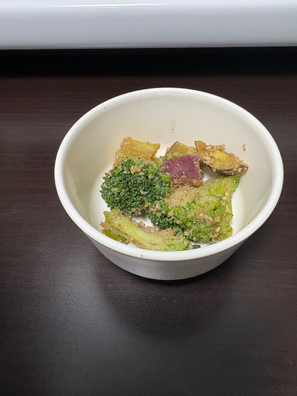 2.耐熱容器にさつまいもと冷凍ブロッコリーを入れ、ふんわりラップをして600Wの電子レンジで5分ほど加熱して火を通す。