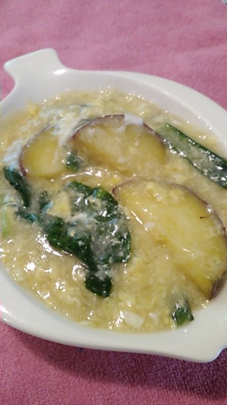 水溶き片栗粉を使ってとろっとさせた中華風卵スープです。小松菜とさつまいもの卵スープのレシピ/作り方を紹介します。