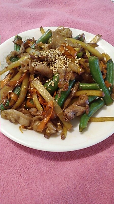 6.器に盛り、白ごまをちらしたらさつまいもと豚バラのきんぴらの完成