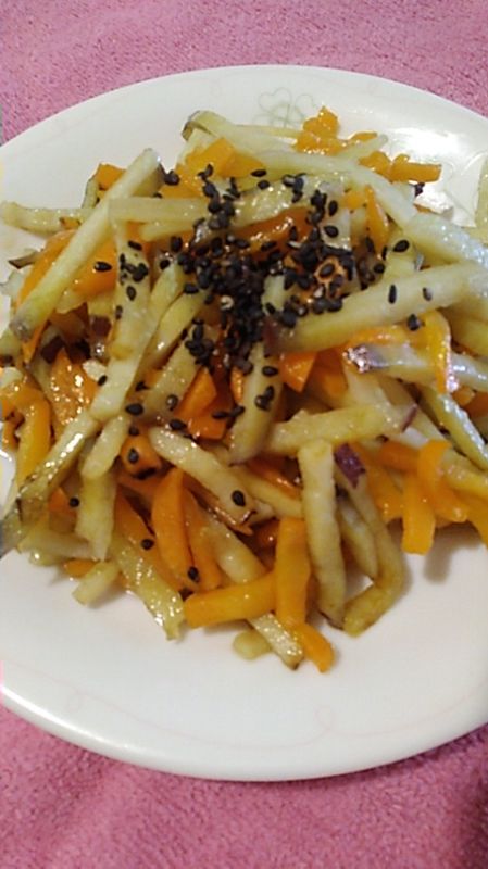 5.器に盛りつけ、黒いりごまを散らしたらさつまいもとにんじんのきんぴらの完成。