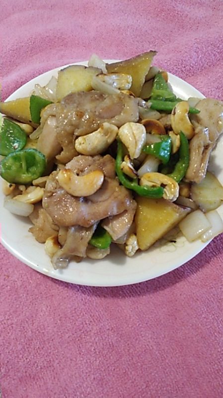 11.全体に味がなじみ、鶏もも肉に火が通ったら器に盛り付けて、さつまいもと鶏もも肉のカシューナッツ炒めの完成。