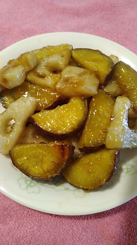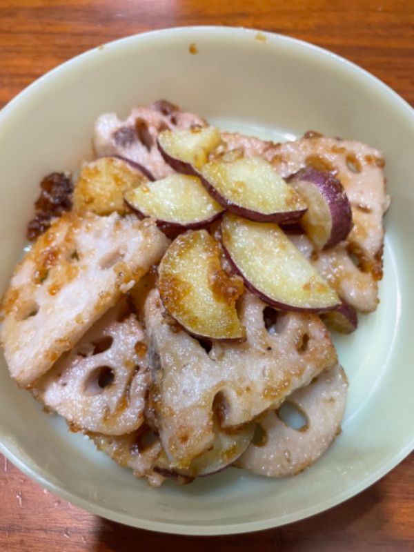 片栗粉をまぶしてカリッと揚げ焼きに!バターの香りと甘辛い味付けがおいしいさつまいもとれんこんの甘辛バター炒めのレシピ/作り方を紹介します。