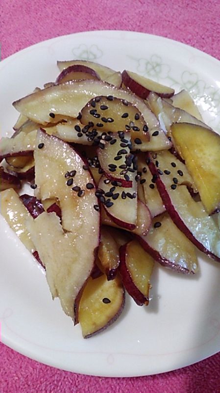 5.火を止めて、黒ごまを散らして器に盛り付けたらさつまいもの塩きんぴらの完成