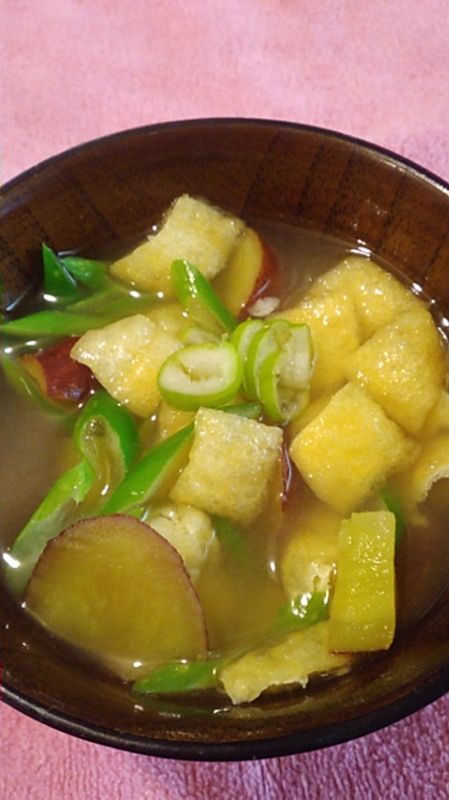 さつまいもと長ねぎの優しい甘み、そして油揚げもある食べごたえのあるみそ汁です。