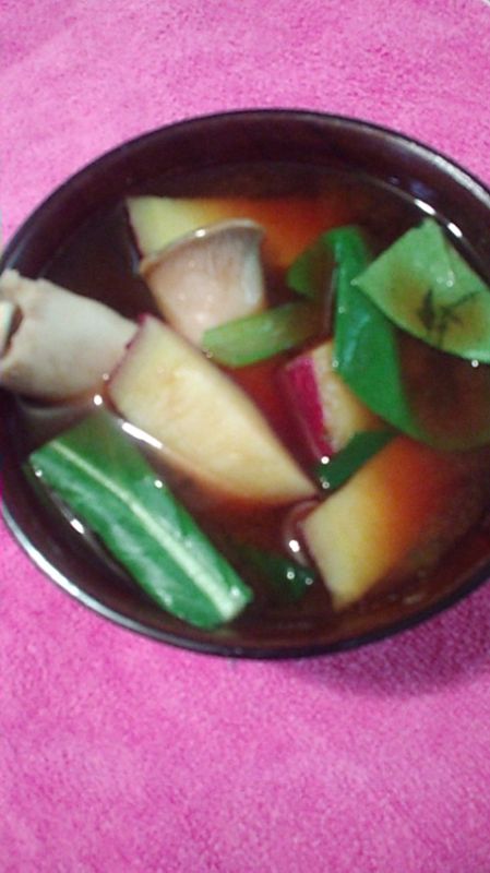 エリンギの歯ごたえが心地よくサツマイモの甘みもしっとりと感じられ小松菜が入っているので色合いもよく赤みそを使ったのでのど越しの良い味噌汁になりました。