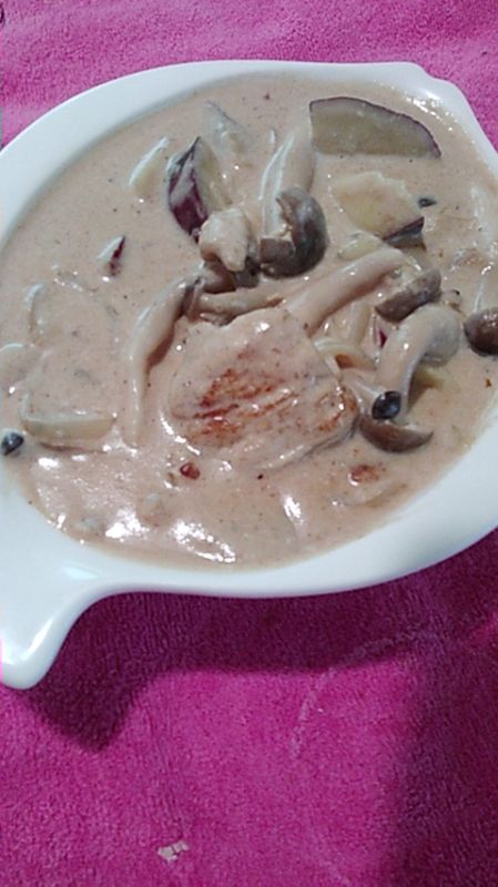 10.クリームソースを入れたら鶏むね肉、ぶなしめじを入れ、黒こしょうを軽くふる。