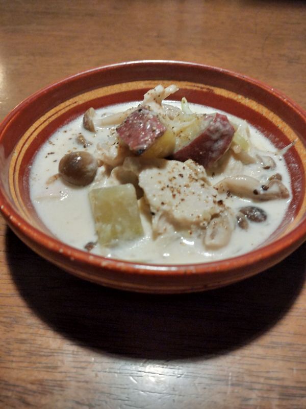 バターと牛乳で作るクリームソースを使ったさつまいもと鶏むね肉のクリーム煮のレシピ/作り方を紹介します。