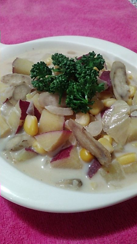 野菜と豆乳による優しい味わいがおいしいさつまいもとごぼうの和風豆乳スープです。味噌によるコクがマッチしています。