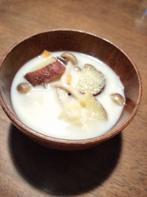秋の旬を詰め込んだ食べごたえのあるさつまいもとしめじの豆乳味噌󠄀スープです。