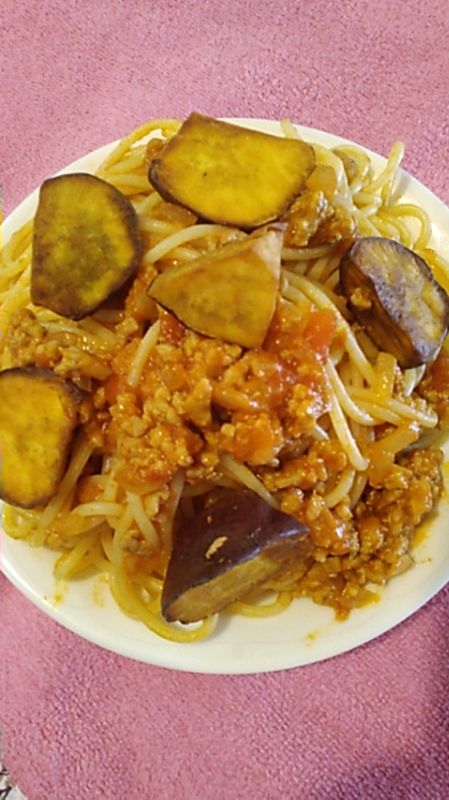 カリッと揚げたさつまいもがゴロゴロとしておいしいさつまいものミートソース風スパゲッティのレシピ/作り方を紹介します。
