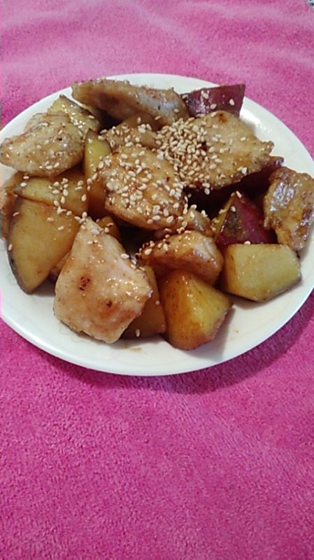 6.鶏むね肉の両面が焼けたら、火を通したさつまいもを加え、2.3分炒める