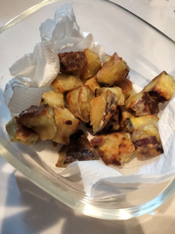 1.さつまいもは皮つきのまま一口大サイズにし、5分ほど水にさらしたら水気を切る。