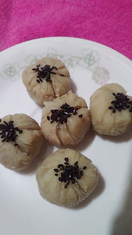 4.ラップにさつまいもペーストと黒いりごまをのせて包み、端をねじって成型したら完成