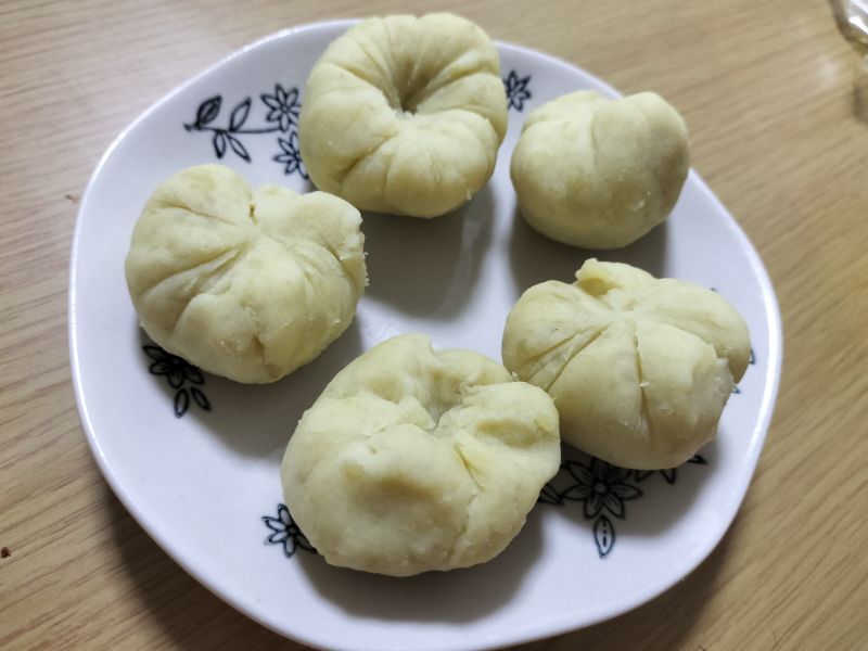 ・形を作るときには、ラップの上部を片手でひねり、もう片方の手でさつまいも餡をひねったラップのしわに押し付けるようにしましょう。
