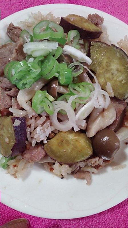 6.炊き上がったらすぐに全体を混ぜて茶碗に盛り、お好みできざみ葱をかけてさつまいもの炊き込みご飯の完成。