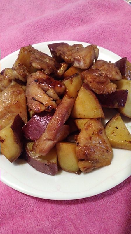 6.器に盛り付けて、フライパンに残ったたれをかけたらさつまいもと鶏もも肉の照り焼きの完成。